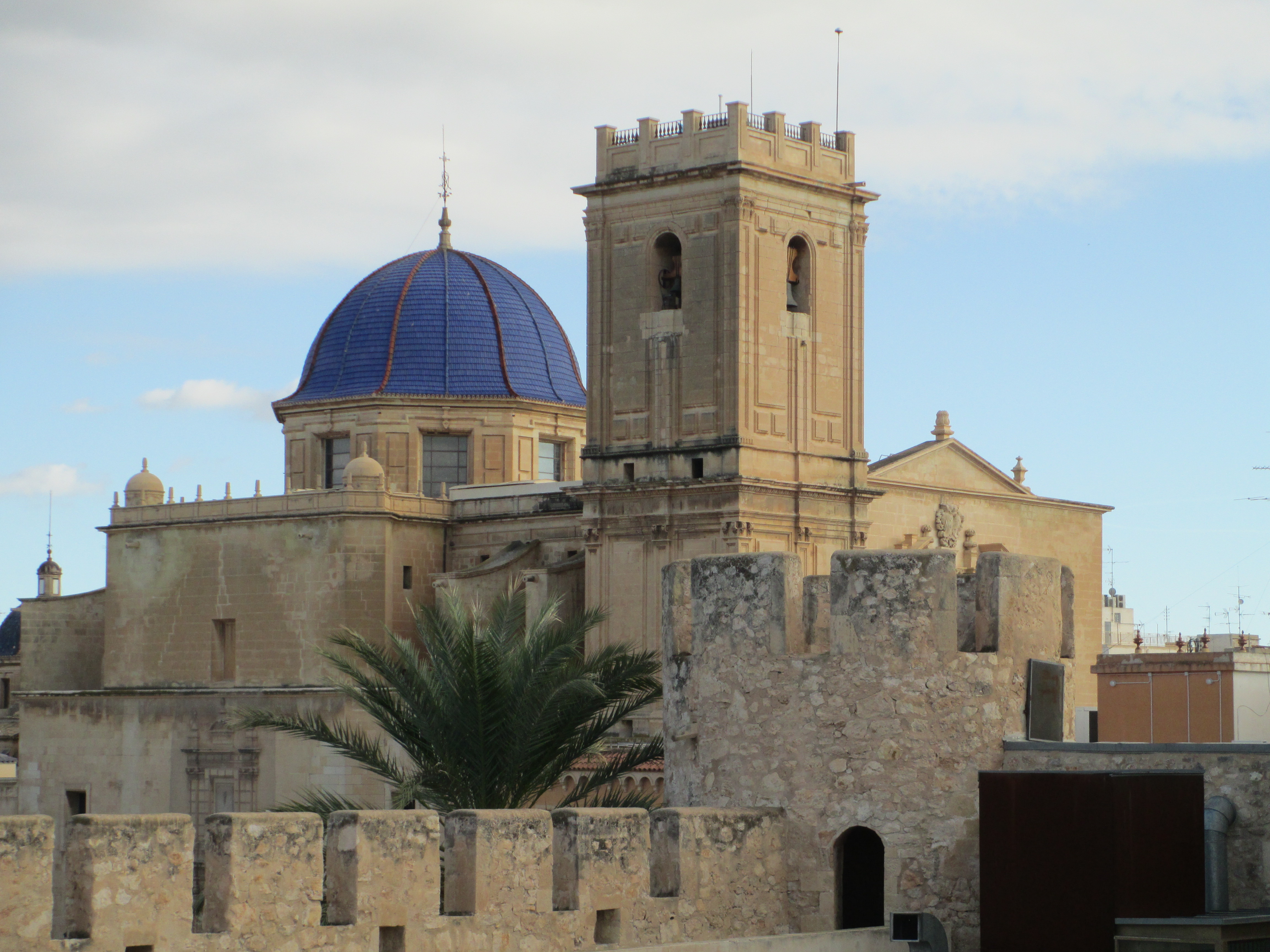 Across the street from the MAHE and Palmeral is the city centre where there are a number of visit-worthy historical sites. The Basilica of Santa Maria has layers of history, with a beautiful Valenciana Baroque façade. Originally a Mosque, after the Reconquista, a Catholic Church, probably Gothic style, was built. It was here that the liturgical drama, Misteri, Elche Mystery Play, was first presented. In 2001, it was declared a UNESCO “Masterpieces of the Oral and Intangible Heritage of Humanity,” and is performed every August in conjunction with the Assumption of Saint Mary. Later the church was rebuilt with different styles over the centuries, eventually with the current emblematic regional blue tile domes.