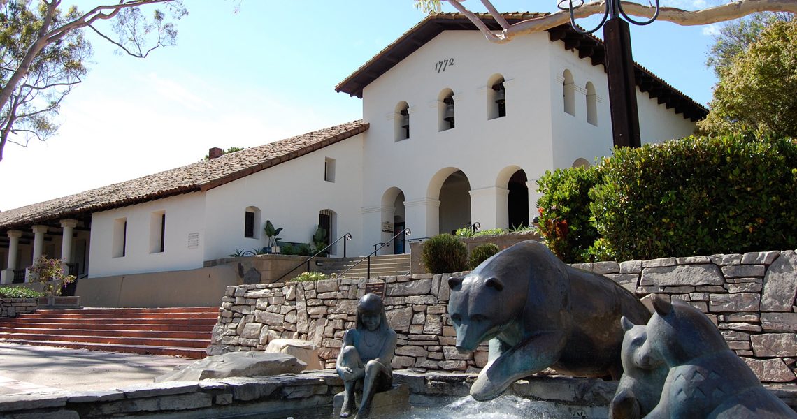 San Luis Obispo Mission (1772), with bronze sculpture of local bear