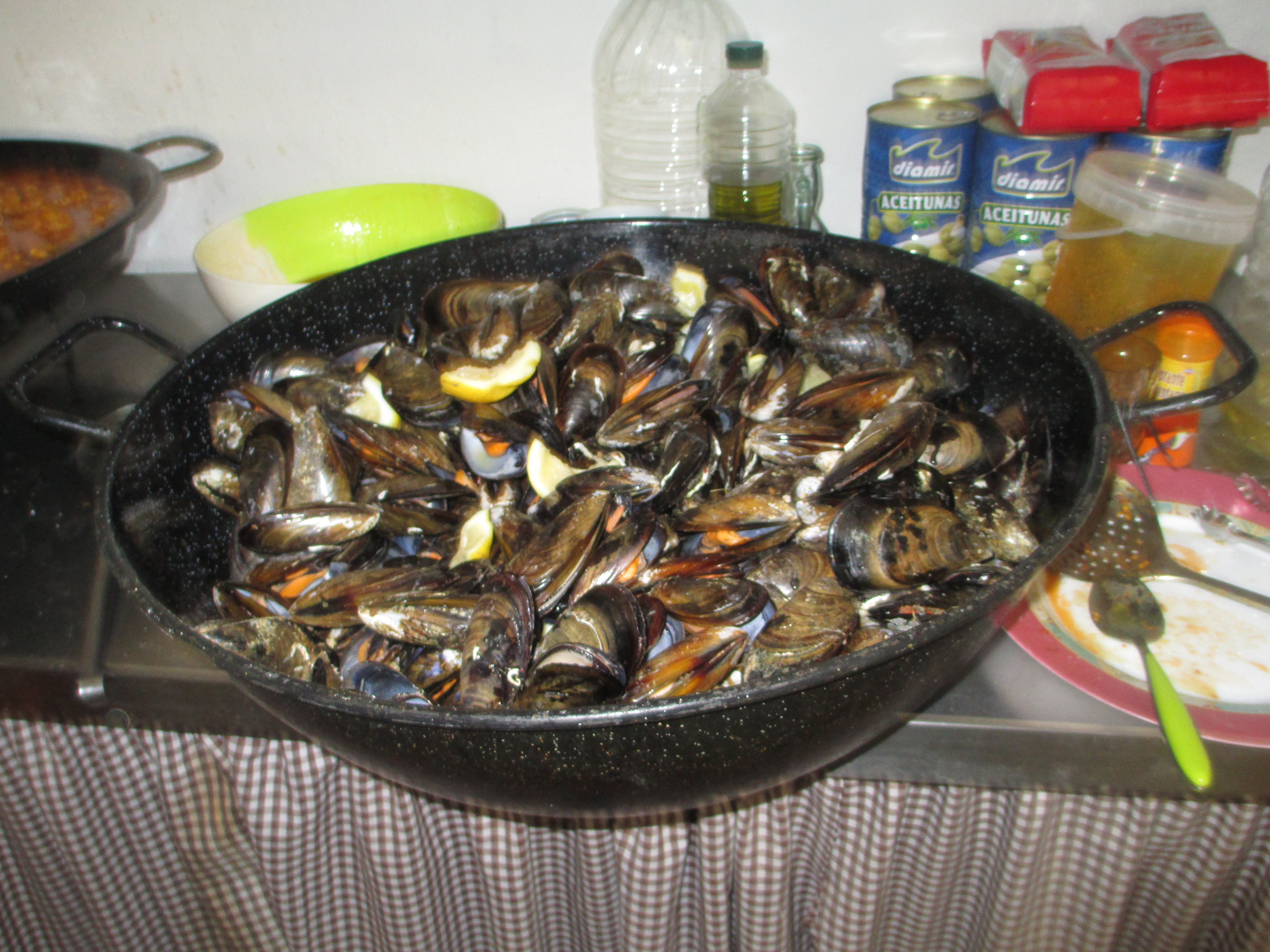 After her cooking creations were bundled for transport on party day, we took the short drive up the hill to the large outbuilding where the fiesta was to occur. Typical of this area, were two huge pans, one of paella and the other of mejillones (mussels) being expertly prepared by two local women. Paella, after all, is originally from Valencia, and Altea is part of the Communitat Valenciana (as they say in the local Valenciana dialect.)
