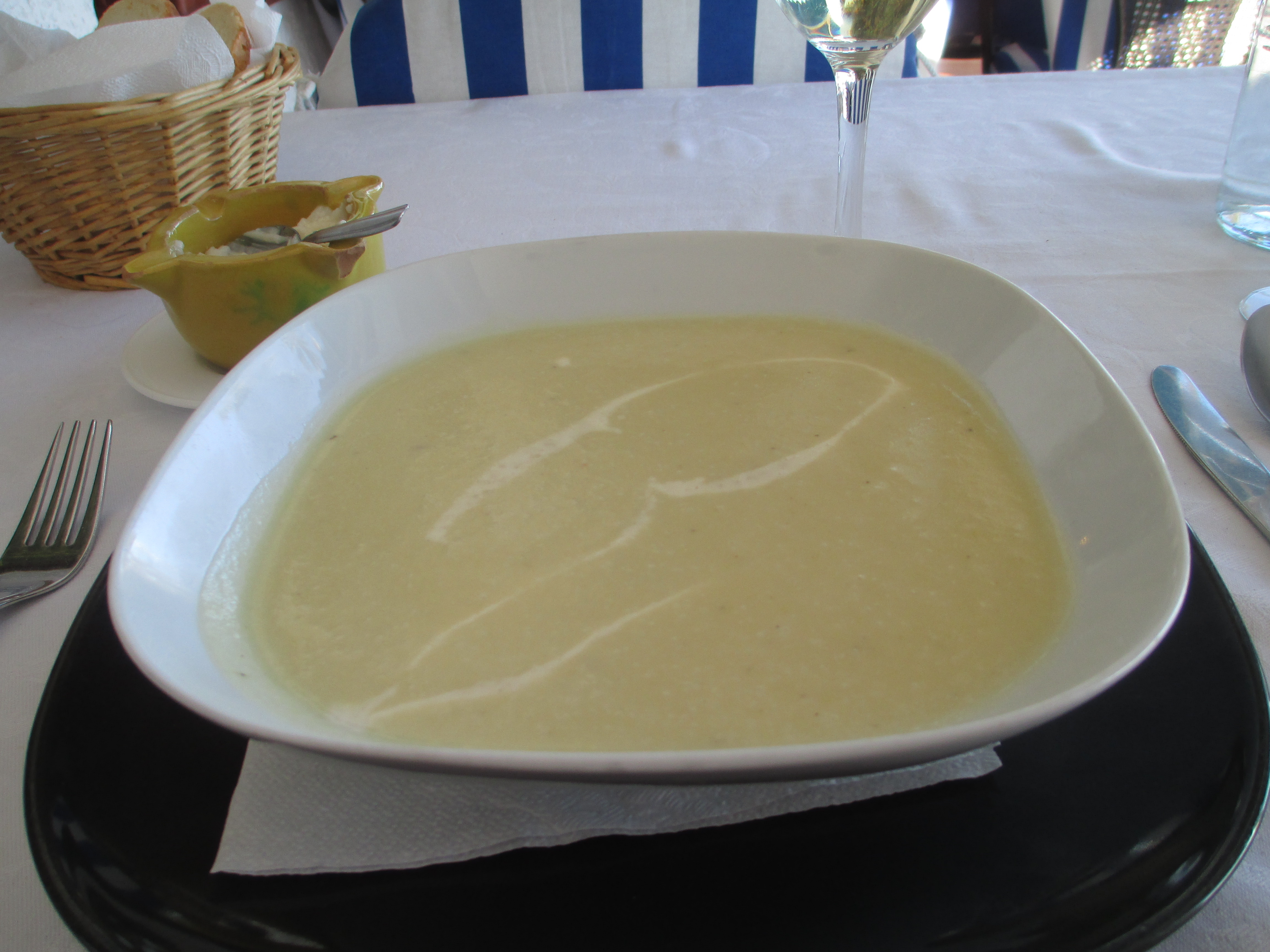 pan y alioli (bread with Spanish version of aioli which has no egg). Note the container for the alioli can also be used as an ashtray. More about that on my humorous look at rules for smoking in Spain to be posted soon.